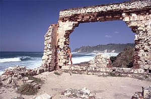When You drive down across the golf course (be carefull with the balls flying around!) You come down to a ruined old spanish lighthouse in an area, that is pretty wild. Steep cliffs, wide sand beaches, palm trees, stunning and mostly untouched nature. The area is very beautifull with the intense blue of the sea contrasting the lush green of the vergetation and the different shades of ocre and red of the cliffs. Forces of nature are strong here as the ruined lighthouse documents. With every stronger earthquake it falls more into pieces. Similar power comes with the waves which come out of deep ocean and hit corall reefs. Swells can be huge as the deep ocean trench which is to blame for the earthquakes comes very close to this part of the island. North atlantic winter gales send their energy through that trench like some swell highway that never puts any speed limits to the swells.