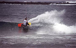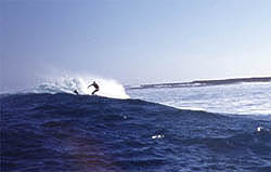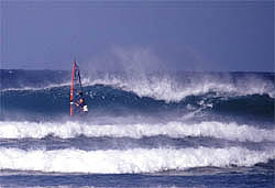 windsurfing: depending on the tides getting in and out of the water is a very tricky thing as You have to dance over sharp lava rocks while the wind tries to take away Your stuff. usually the wind comes from the northeast which means side to sideoffshore. Calculate this when trying to get back to the northern launching area. The bay has perfect flat water to warm up or recover after a wipeout. Pass the northern reef in safe flat water, sail upwind and pick Your waves. Perfect frontside rides on a fast wave will reward You. There is allways some nice sections for heavy slashing or the odd aerial. If You don´t start Your ride too deep wipeouts won´t be too bad as the current drags You directly to the channel. Still, a lot of experience is needed to sail here as the waves are serious and the sideoffshore winds make it hard to return to firm land.