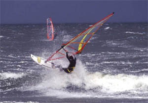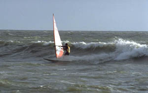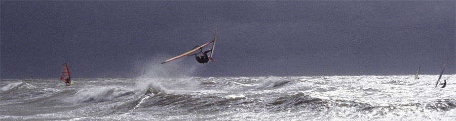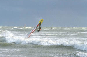 windsurfing: as said before, the place often offers good beginner to intermediate conditions with flatwater or bump n´ jump conditions. Best wind conditions for those are east to southeast and lighter westwinds. Southerly winds come full onshore and bring heavy waves. This is for experts only and even for them, the jetties make it difficult to sail. Winds from the west to northwest come sideon to sideshore. When they are strong enough, some decent waves make it over the before mentíoned sandbar and bring fun wavesailing conditions. Waves are best from mid to high tide. With a fat storm and winds from the northwest these wavesailing conditions can get really good with clean 11/2m faces that allow a string of nice frontside turns and the one or another areal. Add to that small but steep ramps and sails the size 4.5 and You know that this can be fun when elsewhere at the north sea survival is the call.