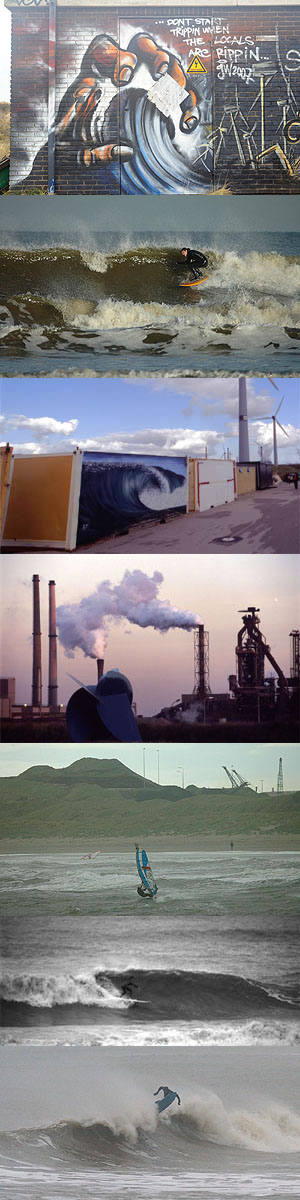 That monster disturbs the natural sandflow which in this case means less outside sandbars and more powerfull waves close to shore. Plus, it refracts northerly swells so that they double up in small but sucky peaks. All this means, that when everywhere else is kneehigh, here You get shoulderhigh and fairly powerfull waves that are very suitable for shortboard surfing. And the water is allways a bit warmer than at the natural parts of the coast. May be because of the abuse of the river by the industrie around.