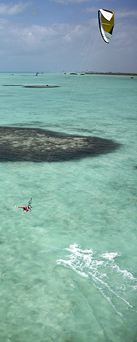 Obviously the wind god was happy with the sacrifices and wind dances that were performed by the riders, because at the next morning these were woken by clearly audible wind sounds. The first kiteboarders already tested the conditions before breakfast. Organizers Scotty and Charlie had prepared an absolute highlight for the day. All riders got a shuttle to Low Beach, a narrow launching site within the mangroves. One after another the kitejammers launched and after a few meters had found their new dream spot. You could see their grins from the helicopter and consequently amateurs and pros alike ripped hard at this presumably unknown spot that showed its full potential.